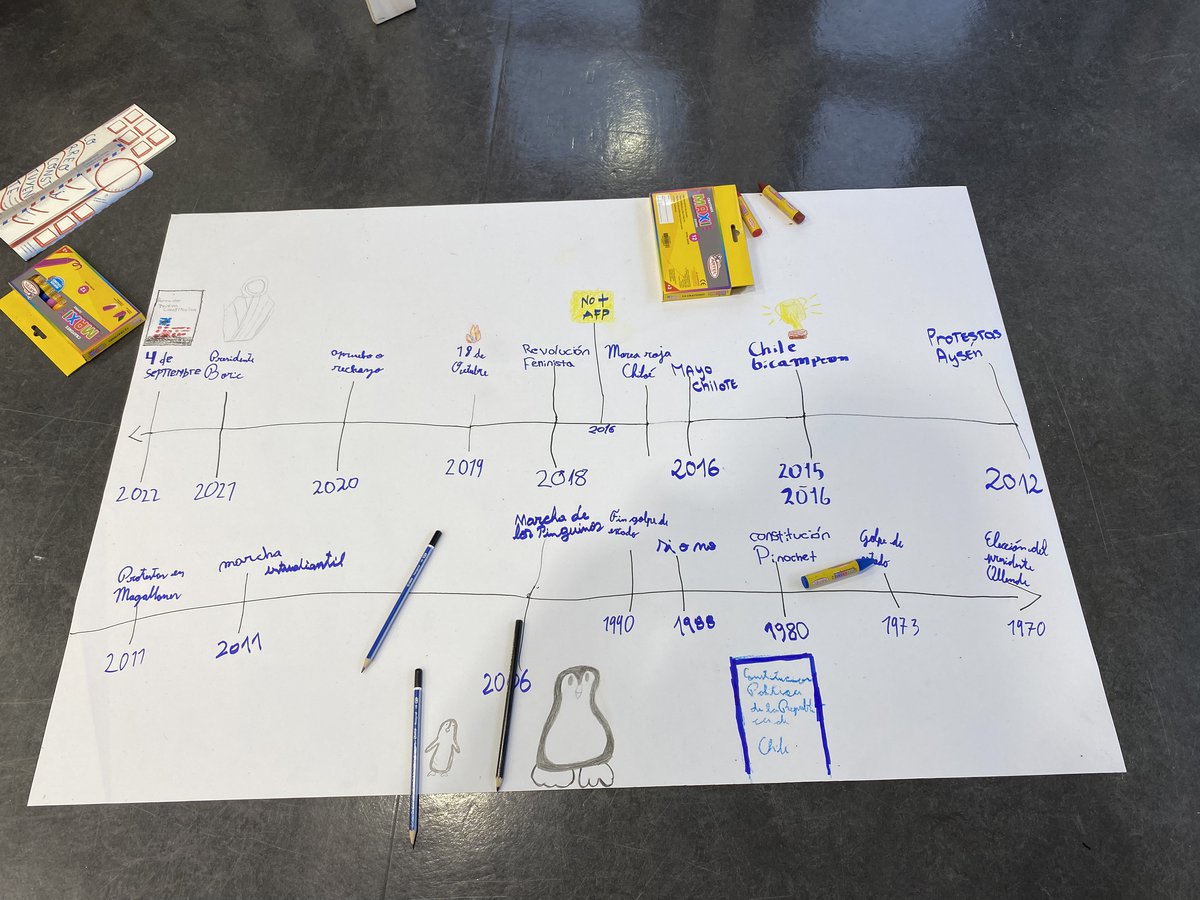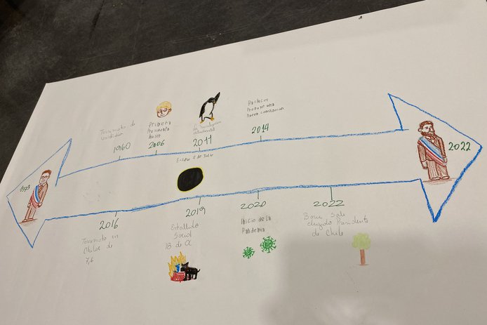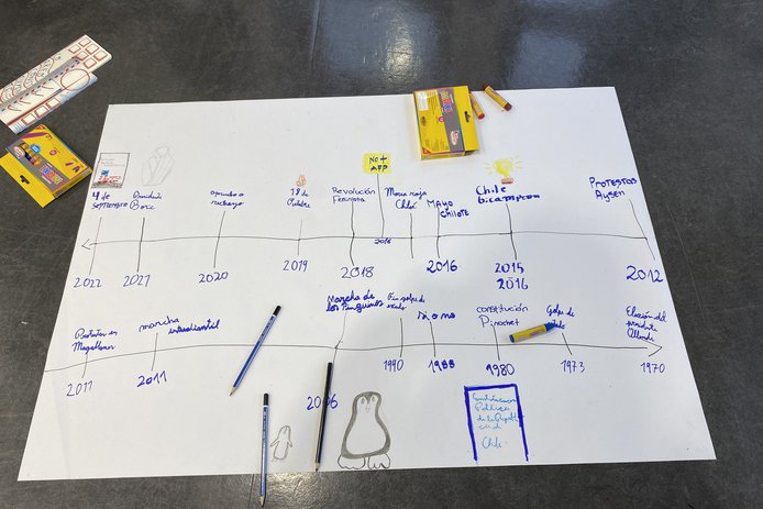 Finalmente, el tercer día se realiza la “Cartografía Constituyente”, donde los y las estudiantes elaboran un mapa a escala de los hitos que estan en sus barrios y caminos a los liceos. La idea es dejar fluir la creatividad, por lo que pueden utilizar lápices, plumones, recortes, stickers, lanas, entre otros. Además, se les entregan algunas de las fotografías impresas que tomaron el día anterior para que también las puedan ubicar en el mapa. El objetivo es cerrar el proceso de una manera visual y tangible para los participantes bajo sus ideas y mirada.