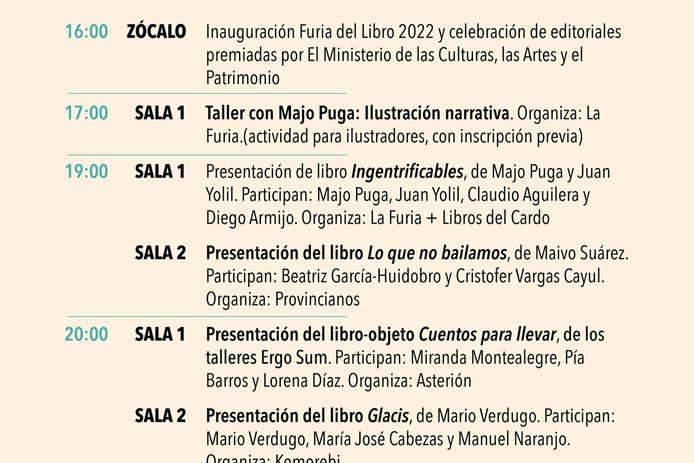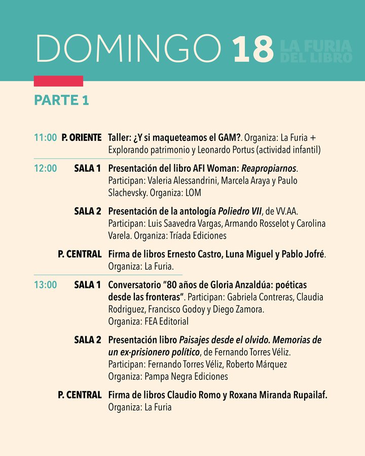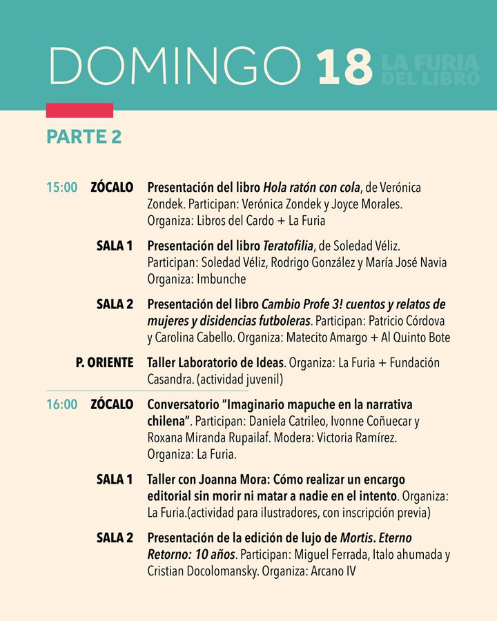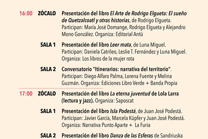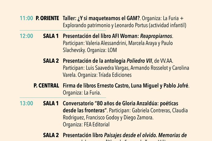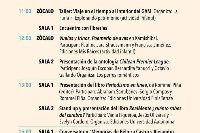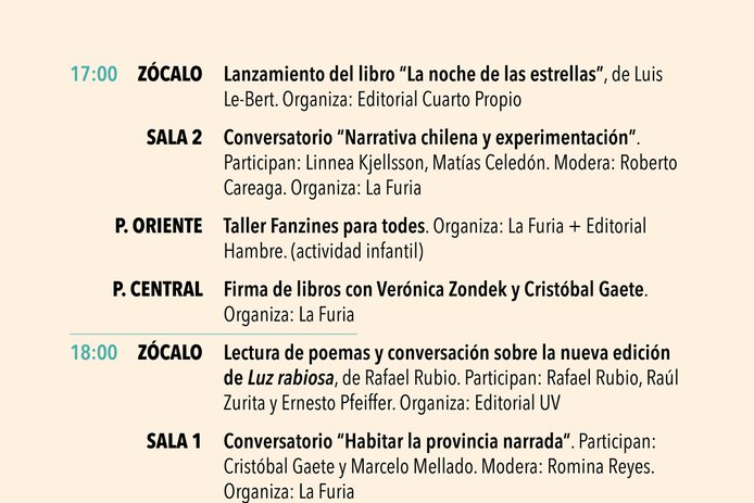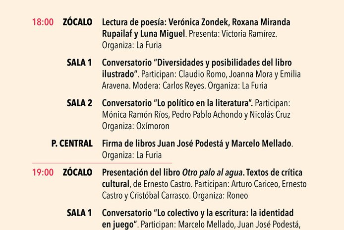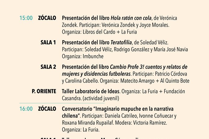 Dentro de los conversatorios destacan el de Daniela Catrileo, Ivonne Coñuecar y Roxana Miranda Rupailaf, quienes dialogarán en "Imaginarios mapuche en la narrativa chilena", y “Habitar la provincia”, en el que Marcelo Mellado y Cristóbal Gaete reflexionarán sobre la escritura desde regiones. La instancia también tendrá actividades familiares como la presentación de poesía infantil junto a Verónica Zondek y su libro Hola ratón con cola (Ediciones Libros del Cardo)