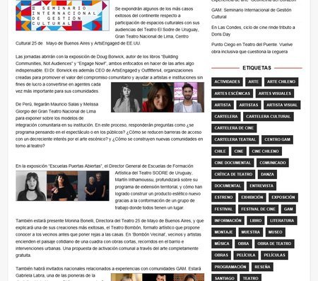 El trabajo conjunto con comunidades y los nuevos desafíos en el liderazgo de espacios culturales son los ejes a tratar en el II Seminario Internacional de Gestión Cultural. Desde Estados Unidos llega Doug Borwick, CEO de ArtsEngage una organización que capacita y asesora a creadores e instituciones artísticas que buscan involucrarse con sus comunidades de manera más efectiva.