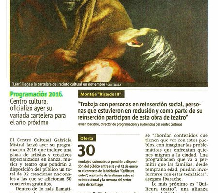 Una vez finalizada la presentación, fue el turno del director de Programación y Audiencias, Javier Ibacache, quien presentó las obras del 2016 entre las que destacan 32 creaciones nacionales de teatro, danza y música que estarán en estreno; la celebración de los 50 años de danza independiente en Chile y una temporada de programación familiar enfocada en los pueblos originarios.