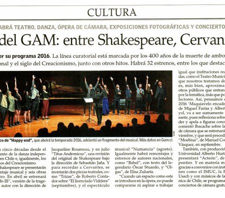 “Al igual que en temporadas anteriores, la programación se ha estructurado sobre la base de determinados énfasis que se complementarán con actividades de desarrollo de audiencias, como la conmemoración del cuarto centenario de la muerte de William Shakespeare y Miguel de Cervantes, el centenario del Creacionismo, los 50 años de danza independiente en Chile y los 60 años de la muerte de Bertolt Brecht”, detalla Javier Ibacache, director de Programación y Audiencias de GAM.