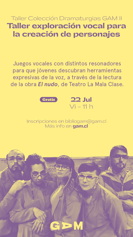 Taller práctico orientado a jóvenes entre 14 y 18 años interesados en explorar herramientas expresivas de la voz mediante el reconocimiento y juego vocal con distintos resonadores. Nuestra voz tiene infinitas posibilidades y les participantes de este taller descubrirán sonidos nuevos y diferentes que aplicarán en la lectura de fragmentos de la obra El Nudo de Teatro La Mala Clase, cuyos múltiples personajes cobrarán vida mediante sus voces.