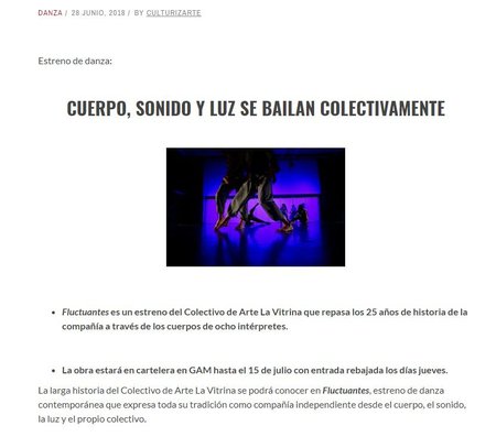 Un estreno del Colectivo de Arte La Vitrina. Una obra de danza contemporánea que revisa la larga historia de esta compañía independiente desde el cuerpo, el sonido, la luz y el colectivo.