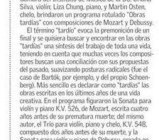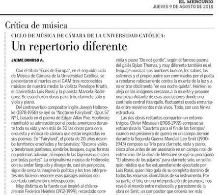 El 7 de agosto, el concierto Ecos de Europa, traerá piezas para viola, clarinete y piano a cargo de Penélope Knuth, Luis Rossi y Marcela Rodríguez. Comenzarán con Nocturne “Fairyland”, op. 57, #1, after Edgar Allan Poe de Joseph Holbrooke. Seguirán con Dúo para Viola y Piano, “Do not go gently” de Federico Heinlein y L’Abime des Oiseaux pour Clarinette de Olivier Messaien. Finalizarán con Trio voor clarinet, altiviool en piano de Leo Smit.
