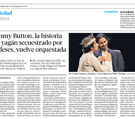 A fines del año pasado se estrenó en Valdivia la versión orquestal de Jemmy Button, con composición y dirección orquestal de Jorge Aliaga. Ahora el montaje se estrena en Santiago, con tres actores-juglares, 10 músicos clásicos y director orquestal en escena.