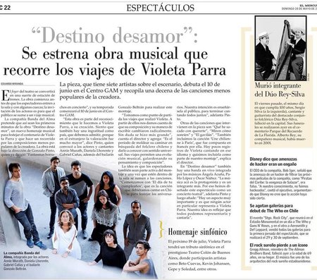 DESTINO DESAMOR. un viaje violeta es una cantata que retrata el viaje musical y personal que la artista vivió en Europa. La obra incluye la interpretación de más de diez canciones suyas, incluyendo temas emblemáticos como Qué he sacado con quererte, Miren como sonríen, La jardinera y Violeta ausente. Las voces a cargo de las canciones y las narraciones son las de tres actores con amplia experiencia musical: Gabriel Cañas (Mercury, la leyenda), Daniela Lhorente (Cabaret) y Annie Murath (Piaf).