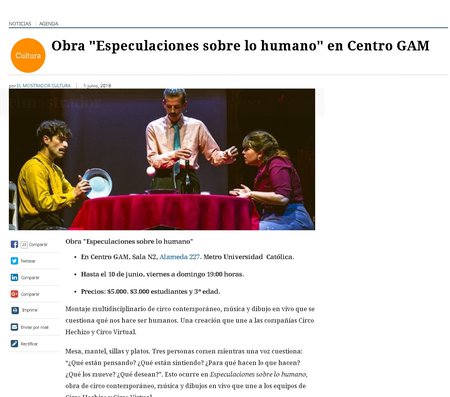 Mesa, mantel, sillas y platos. Tres personas comen mientras una voz cuestiona: “¿Qué están pensando? ¿Qué están sintiendo? ¿Para qué hacen lo que hacen? ¿Qué los mueve? ¿Qué desean?”. Esto ocurre en Especulaciones sobre lo humano, obra de circo contemporáneo, música y dibujos en vivo que une a los equipos de Circo Hechizo y Circo Virtual.