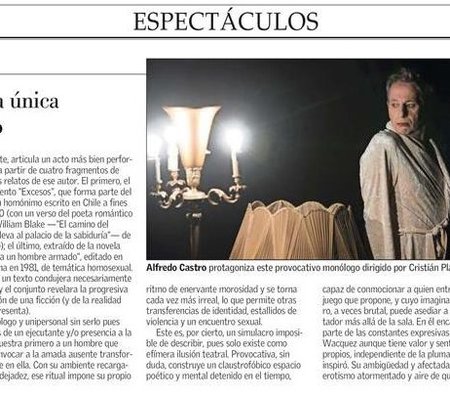Vuelve este monólogo como parte del Ciclo GAM 10 años, donde Alfredo Castro protagoniza la puesta en escena de cuatro textos del escritor chileno Mauricio Wacquez. Una obra dirigida por Cristian Plana, que indaga en el deseo, la ausencia y las posibilidades de la representación.