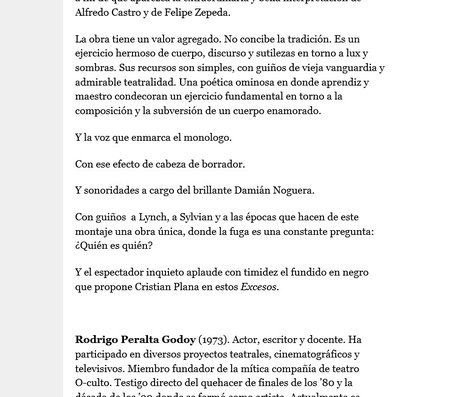 Excesos muestra a un hombre que frente a su deseo de reencontrarse con una mujer que ha perdido, decide convertirse en ella, suplir en su propio cuerpo la ausencia de su amor. La obra extiende el cuento original, adaptando los textos Los domingos, La sonrisa en la boca y Frente a un hombre armado, para presentar fragmentos de escenas posibles, íntimas y crudas, de esa pareja.