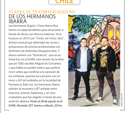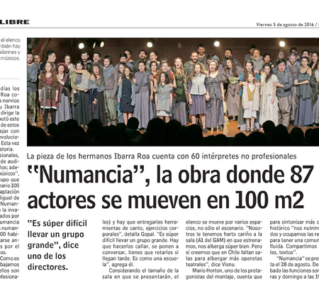 Numancia es una tragedia musical que sube a escena a 87 personas, entre músicos, bailarines, actores y un coro ciudadano con hombres, mujeres y niños, que fueron elegidos por audición abierta. En el elenco está Daniela Lhorente, Mario Horton y Gabriel Cañas, pero el protagonista de la obra es el pueblo, interpretado por el coro ciudadano. Ese protagonismo es uno de los principales motivos para que Gopal y Visnu decidieran montarla.