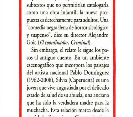 El director y actor Alejandro Goic, promete al espectador ver a una Caperucita como nunca antes imaginó ver, en su versión de esta obra que incorporará los paisajes del artista nacional Pablo Domínguez (1962-2008) en la escenografía.