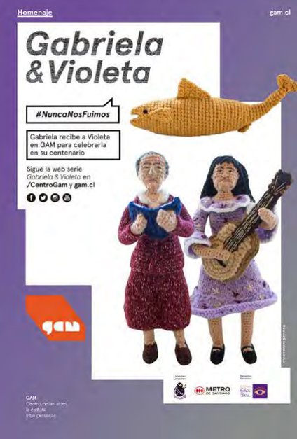 Durante 2017, el equipo de Comunicaciones y Marketing de GAM creó la campaña Gabriela & Violeta, con motivo del centenario de la cantautora chilena. Una curatoría digital y acción de marca que destaca a dos mujeres chilenas, cuyos mensajes son contingentes hoy. Gabriela Mistral recibe a la cantautora en el centro cultural que lleva su nombre (GAM), y la invitó a vivir el Chile de hoy. Las protagonistas, hechas de lana por la diseñadora escénica Macarena Ahumada, recorrieron el edificio y otras locaciones en un viaje por las artes, sus historias y críticas sociales.